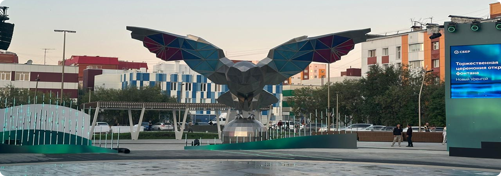 Символом города Новый Уренгой является Сова. Данный проект был выполнен к юбилею города. Общие размеры: высота 9 метров, размах крыльев 14 метров, вес более 10 тонн. г.Новый Уренгой